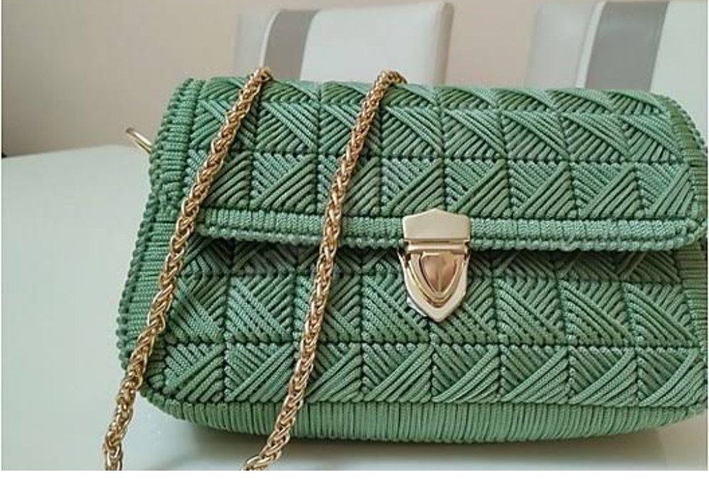 Yeşil renkli örgü kadın çantası, nakış desenli ve zincir detaylıdır. Bohem ve minimalist tarzları günlük kullanıma uygundur.