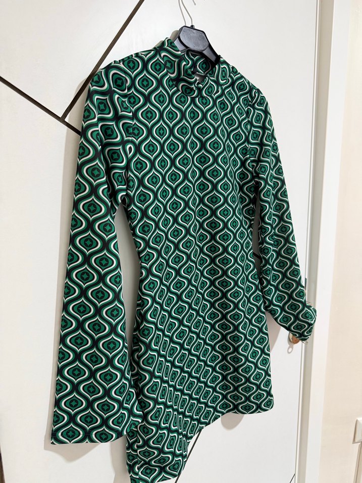 Zincir detaylı, retro tarzda, uzun kollu ve balıkçı yaka, koyu yeşil yılan desenli, vücuda oturan hamile tunik.