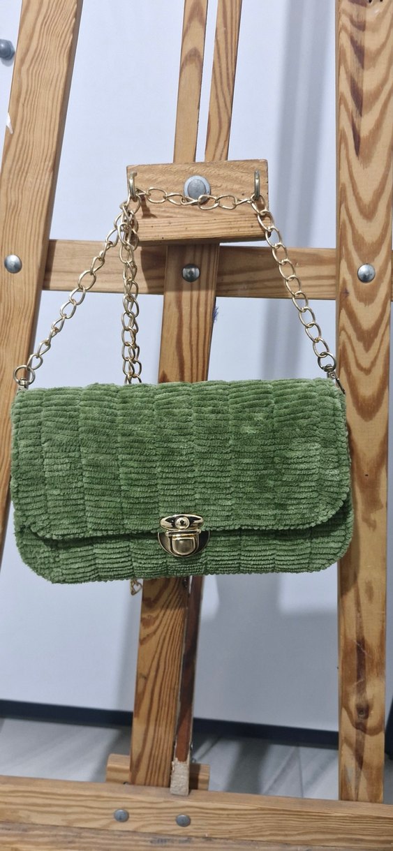 Yeşil süet çanta, zincir detaylı ve yılan desenli, günlük kullanım için bohem tarzda.