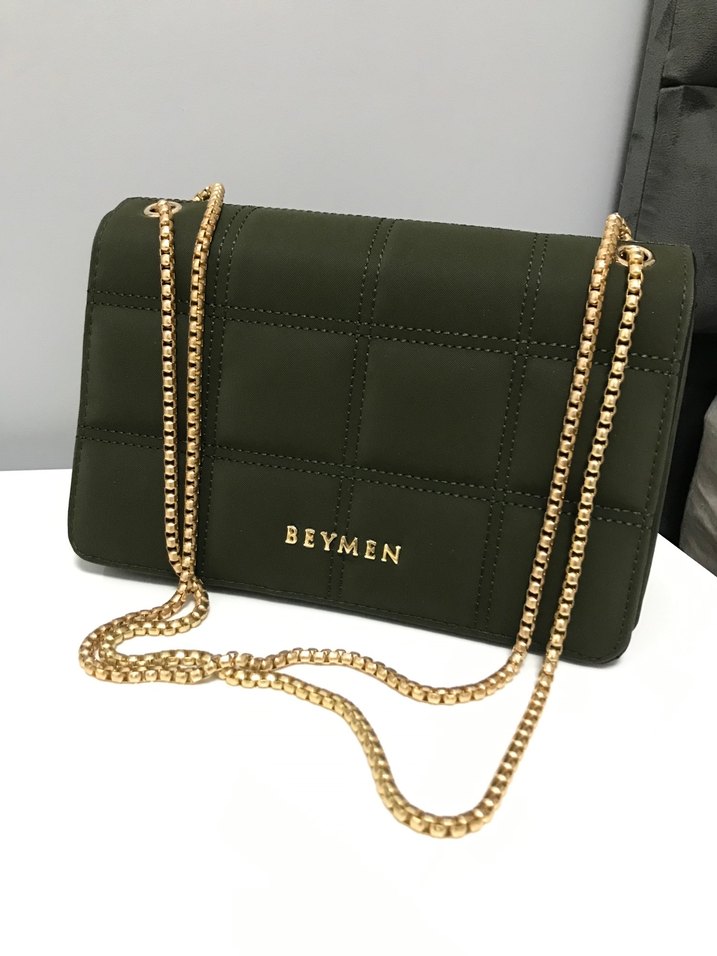 Zincir detaylı, yeşil süet kadın çanta. BEYMEN logosu ile günlük ve şık sokak tarzına uygundur.