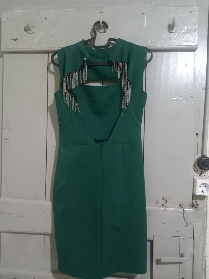 Yeşil uzun abiye elbise, kolsuz ve V yakalı, zincir detaylarıyla dikkat çeker. Avant-garde parti stiline uygundur. ✨