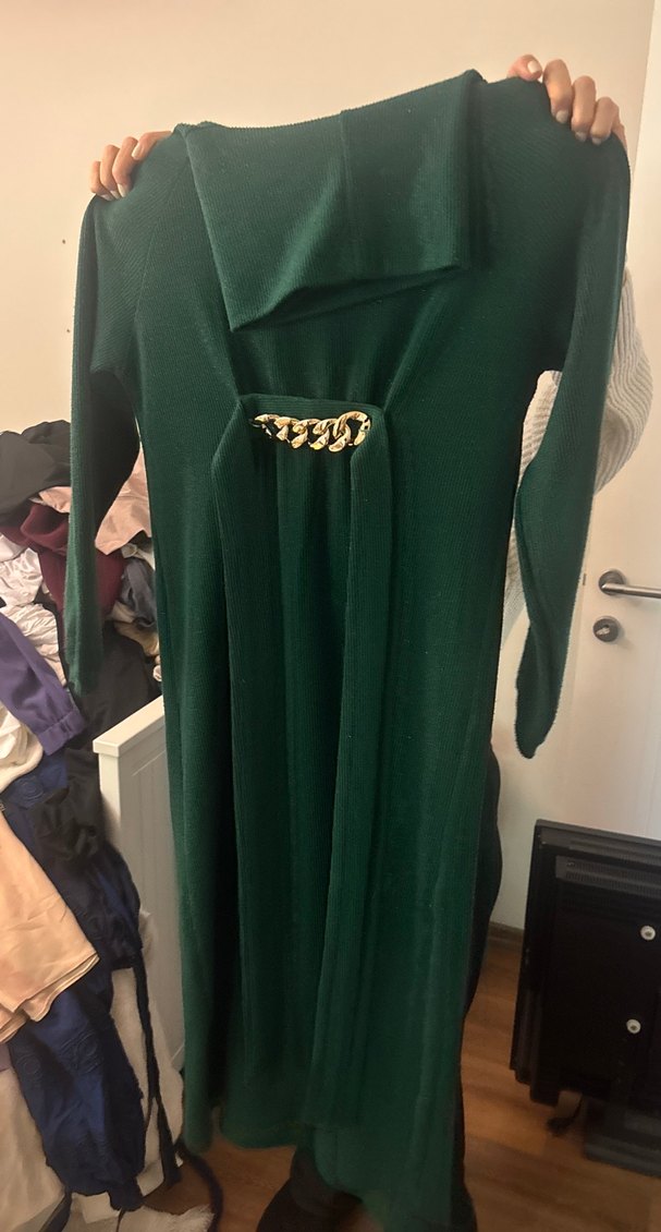 Zincir detaylı, uzun, yeşil, parlak sentetik kumaştan, uzun kollu ve keskin yakalı dar kesim kadın elbise. Sokak modasına uygun. ✨