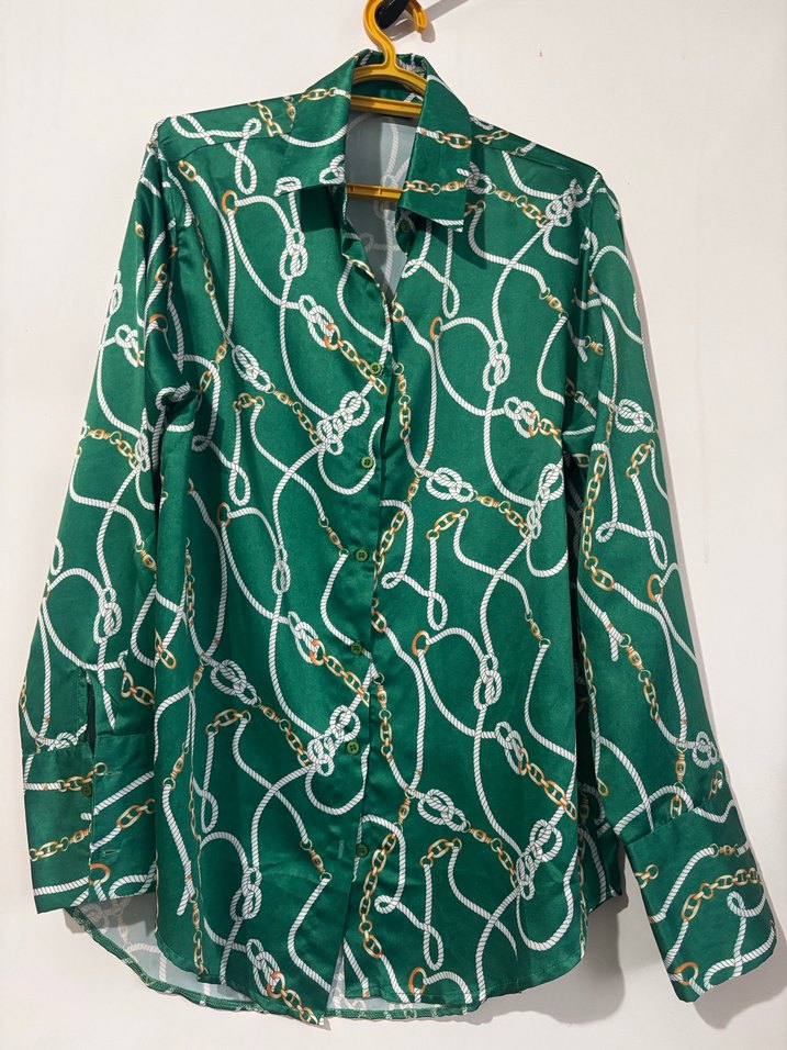 Bu kadın gömleği, yakalı ve uzun kollu olup bol kesimlidir. Parlak sentetik kumaştan yapılmış, zincir detaylı yılan desenine sahiptir, sokak stili ve günlük kullanım için uygundur.