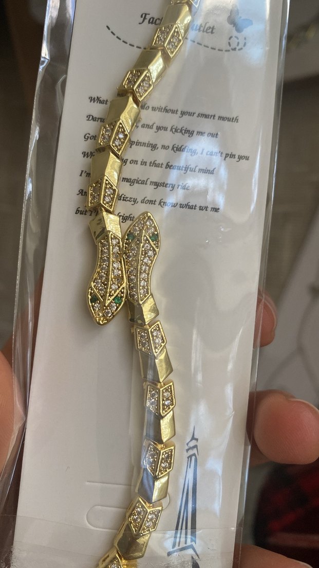 Parlak yılan deseni ve zincir detaylarına sahip altın bileklik, düğünler için uygundur. Şiirsel bir metin içeren kartla birlikte gelir.