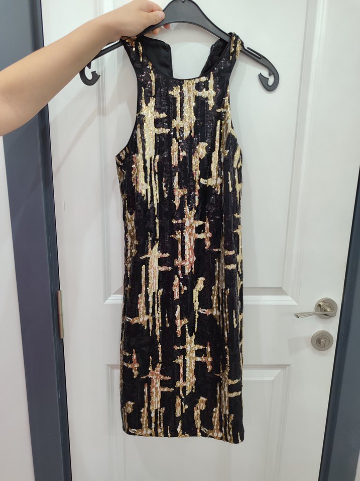 Yüksek yakalı, kolsuz ve zincir detaylı, koyu altın yılan desenli, parti için uygun, vücuda oturan midi elbise.