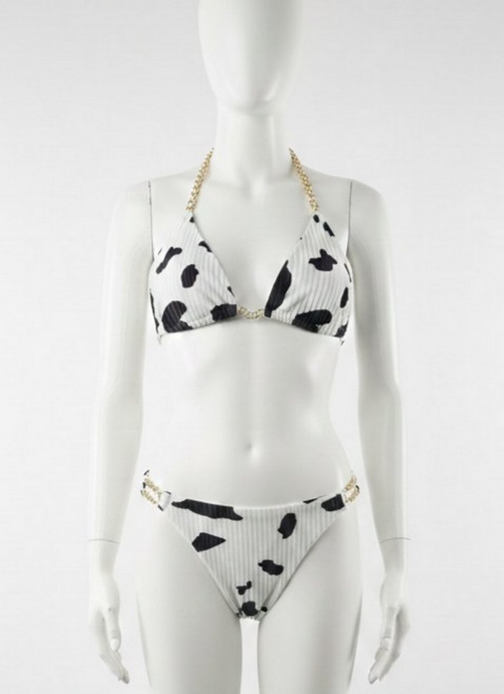Zincir detaylı, zebra desenli, kısa kesim ve vücuda oturan kadın bikini. Cesur ve çağdaş tarzda plaj için uygundur. ️