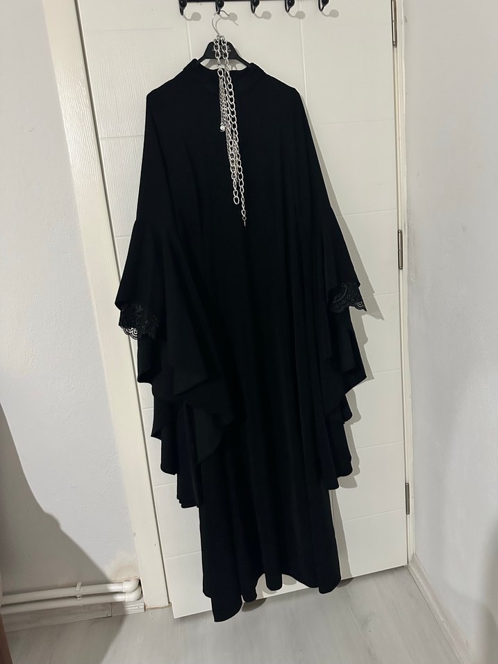 Siyah uzun elbise, yüksek yakalı ve askılı kollu, zincir detaylara sahip. Sentetik kumaştan, rahat ve bol kesim, gece kullanım için uygun. A kesimdir. Gösterişli kol detaylara sahip şık bir elbise. 1 kez giyildi yeni gibi