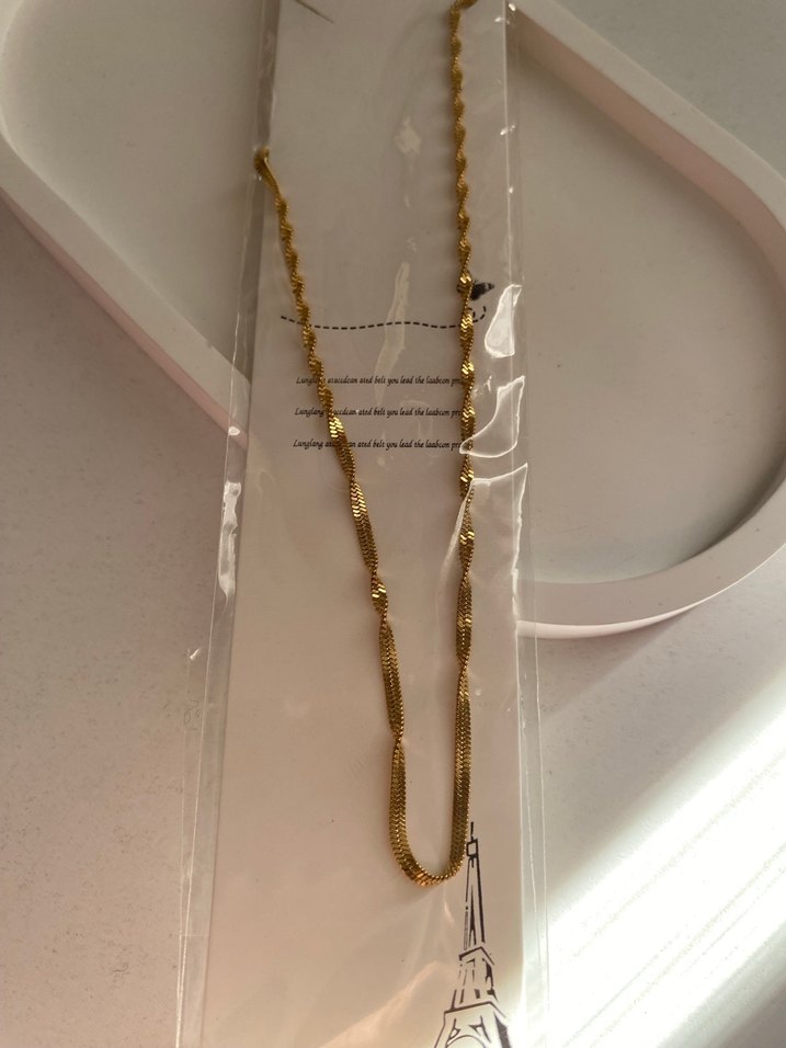 Zincir detaylı, parlak yüzeyli altın kolye. Midi uzunlukta, günlük sokak giyimine uygun Paris tarzı. ✨