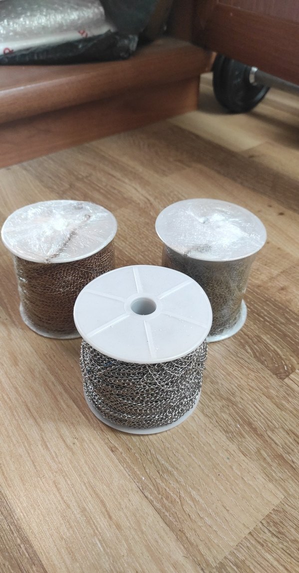 Gri ve kahverengi renklerde üç adet zincir rulosu, çeşitli kullanım alanlarına uygundur. 100 metredir her biri. toplu fiyattir