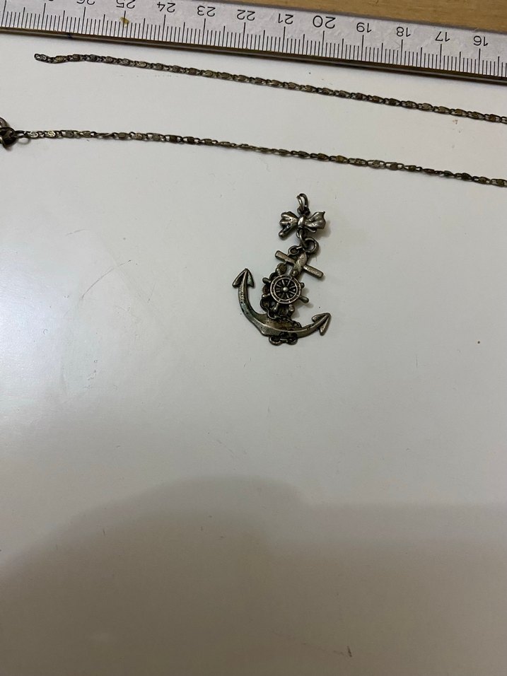 vintage rock punk tarzı çıpa kolye. Normal midi uzunlukta, günlük kullanım için uygun. ⚓ zincirin bir tarafının küçük halkası eksik. Soruları cevaplarım. İade olmaması için. Eskilerden kalma.