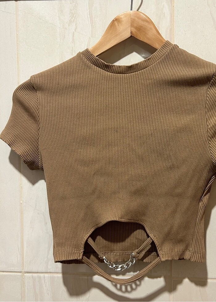 Zincir detayli bej crop Gorselde de belli sag tarafinda bir siyahlik var