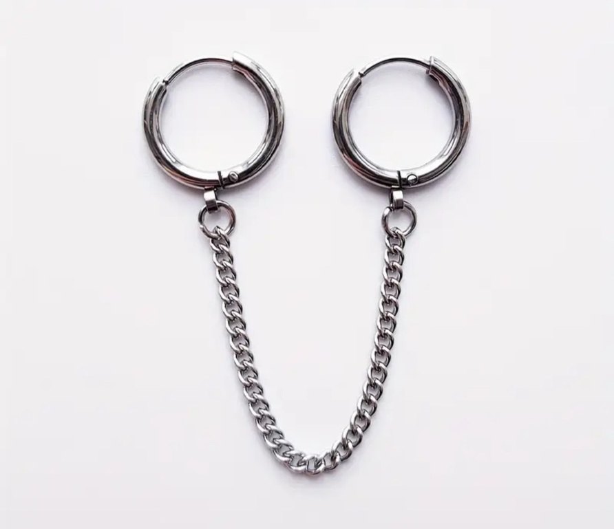 Paslanmaz çelik çift halkalı zincirli küpe. Yeni paketli ürün.