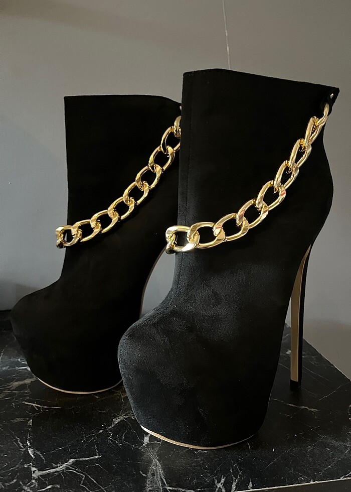 Yüksek topuklu ve platformlu 37 numara. 36 giyiyorum ama 37 oldu süet. Hiç giyilmedi yurt dışından almıştım. Topuk boyu 17-18 cm. Zincir detaylı. Topuklu bot, zincir detaylı topuklu ayakkabı
