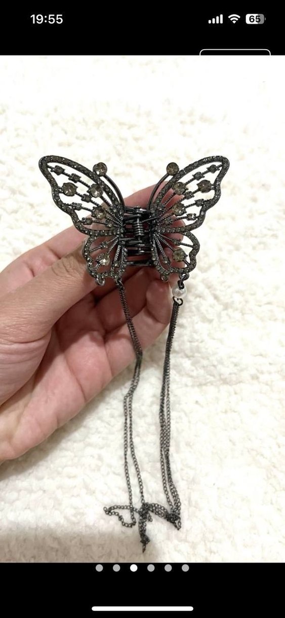 Gri metalden yapılmış, zincir detaylı kelebek tasarımlı saç tokasıdır. Gotik ve bohem tarzını yansıtır.