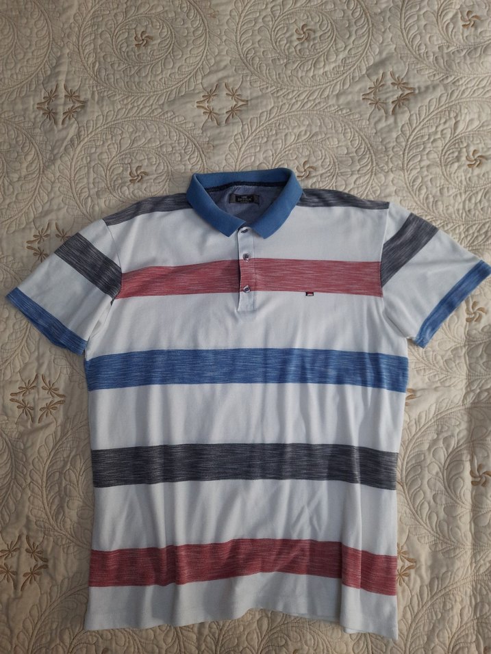 Düğmeli plaketli, kısa kollu ve polo yaka erkek tişörtü. Beyaz zemin üzerine mavi, kırmızı ve siyah yatay çizgilerle tasarlanmıştır. Günlük sokak stili için uygundur. **ÇOK İYİ DURUMDADIR ** ÖLÇÜLEN ÖLÇÜLERİ; boy:70 cm en(omuzdan omuza):50 cm en(koltuk altından):58 cm kol uzunluğu(omuzdan):20 cm