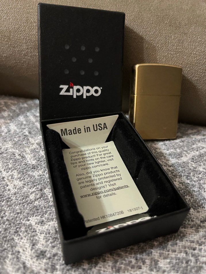 Zippo'nun parlak altın renkli vintage tarzda Siyah kutuda, 'Made in USA' etiketiyle sunulur. Eşsiz karşı kültür tasarımıyla dikkat çeker.