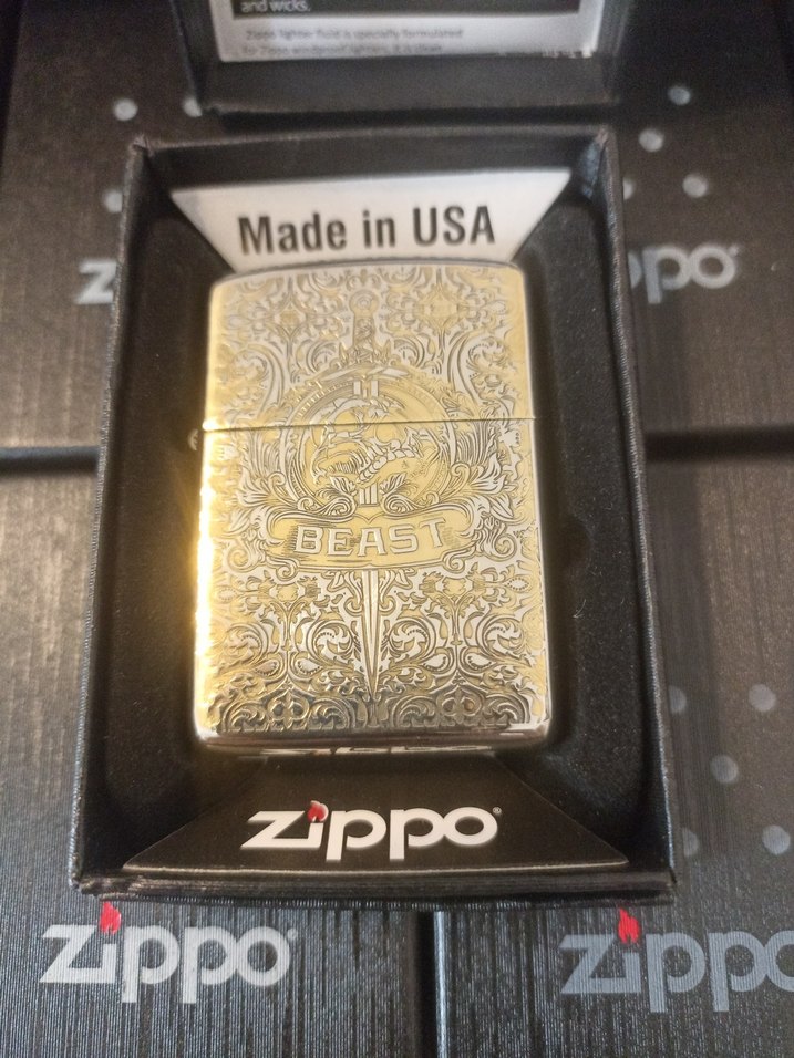 Parlak altın renkli Zippo erkek rozeti, "BEAST" yazılı detaylı vintage biker tarzı oyma desenlere sahip. ABD yapımı, klasik biker tarzını yansıtıyor.