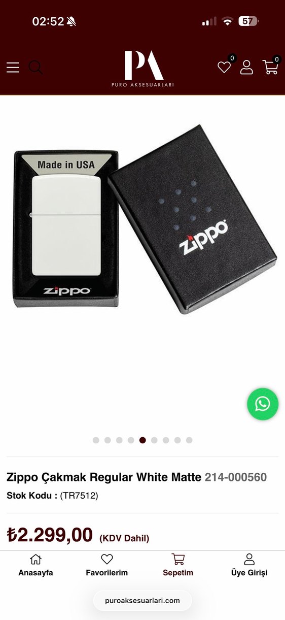 Zippo markalı beyaz , şık tasarım, siyah Zippo kutusunda. Made in USA yazılı.