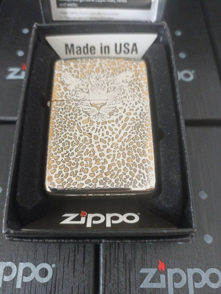 Zippo markalı, altın renkli metal USB flash bellek, detaylı leopar desenli. ABD yapımı, kompakt ve dayanıklı.