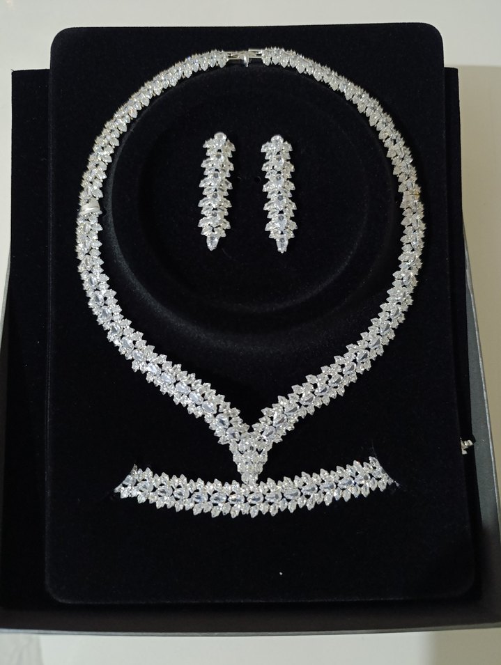 Beyaz işlemeli, boncuk detaylı, kolye, bileklik ve küpeden oluşan çağdaş gelin takısı seti.