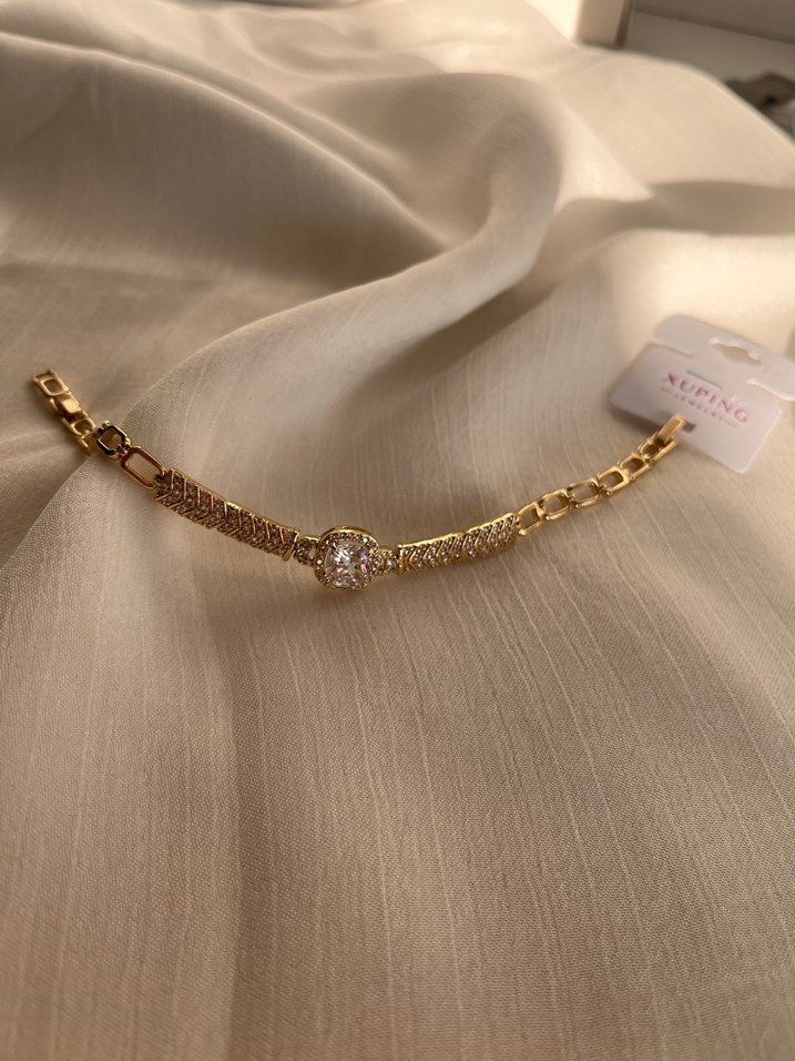 Altın renginde, zincir detaylı bileklik, ortasında parlak taş bulunur, düğün ve klasik şıklığa uygundur. ✨ Paslanmaz çelik
