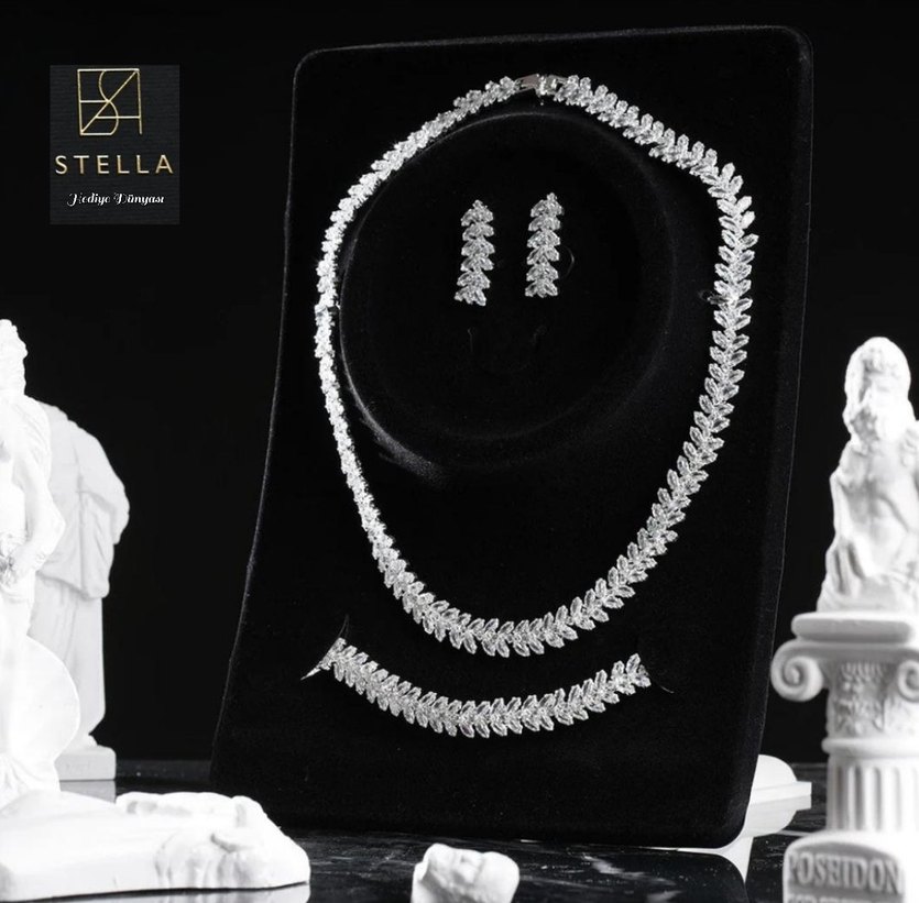 Gelin seti, komple zirkon taşlı desenli, parıltılı çağdaş kadın takı seti. Kolye, bileklik ve küpeler içerir. ✨