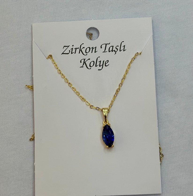 Kısa boylu, mavi zirkon taşlı kolye, detaylı altın zincirle sade ve bohem tarzı bir araya getirir.