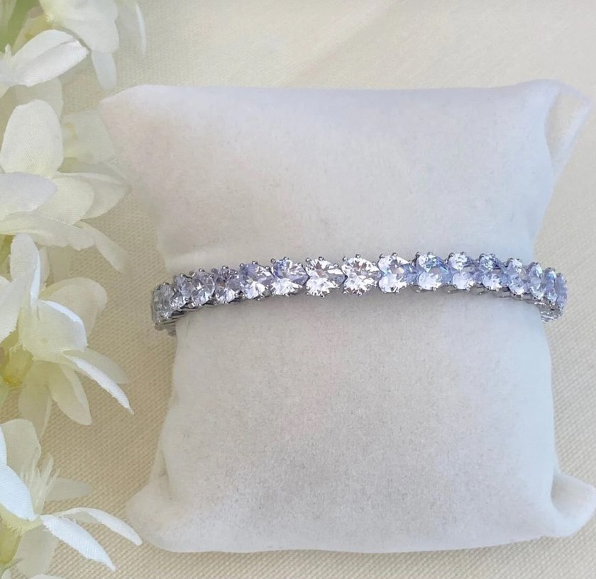 Beyaz taşlarla süslenmiş, minimal ve çağdaş tarzda kadın bileklik. Düğünler için klasik ve zarif bir görünüm sunar.