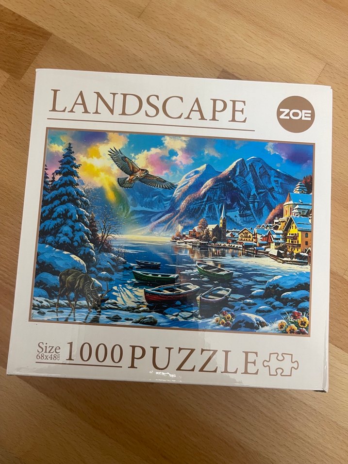 ZOE markasının 1000 parçalı puzzle'ı, dağlar, göl, tekneler ve doğa manzarasını koyu ve altın tonlarında sunar.