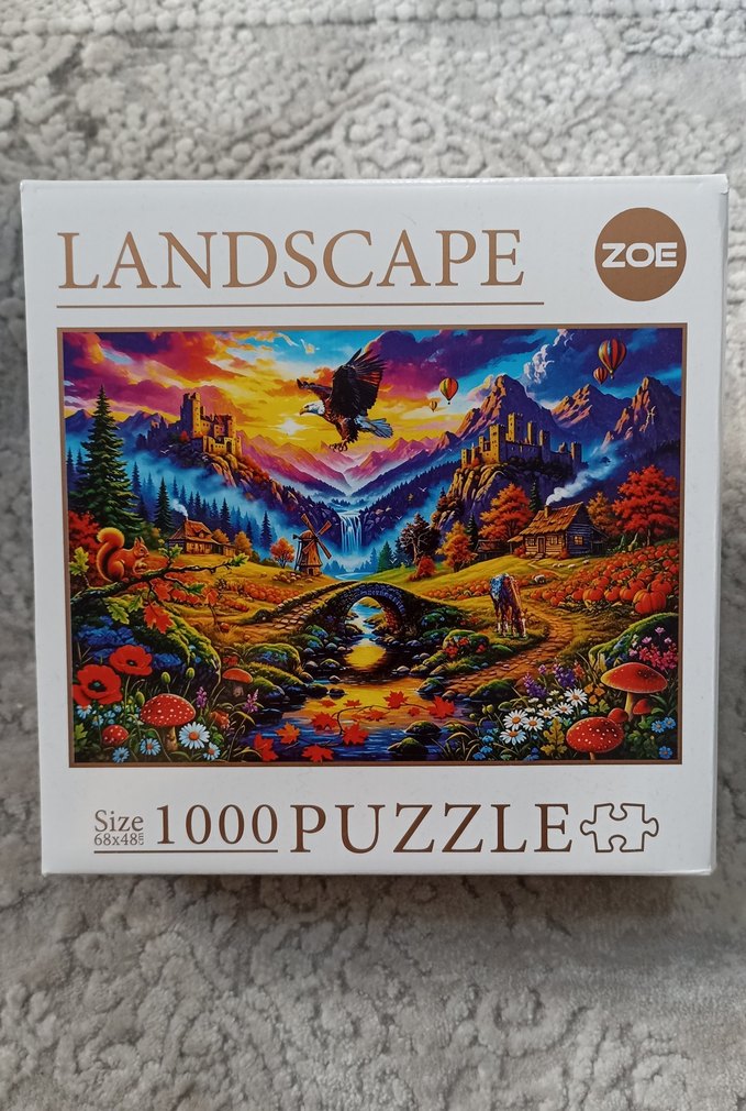 Zoe markasına ait 1000 parçalık puzzle, canlı renklerle detaylandırılmış doğa ve fantastik manzara sahnesi sunar. Boyutu 68x48 cm.