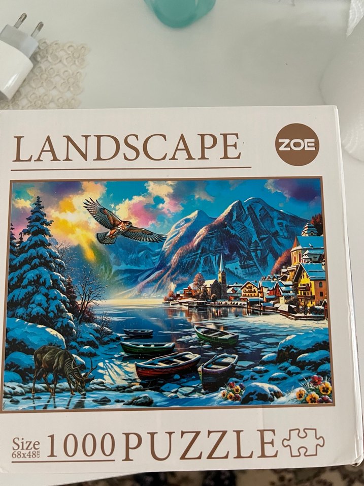 ZOE Landscape 1000 parçalık puzzle, 68x48 cm boyutunda, dağ ve göl manzarası ile tekneler ve karda yaşamı gösterir, eksiksizdir. 1 kez yapıldı.