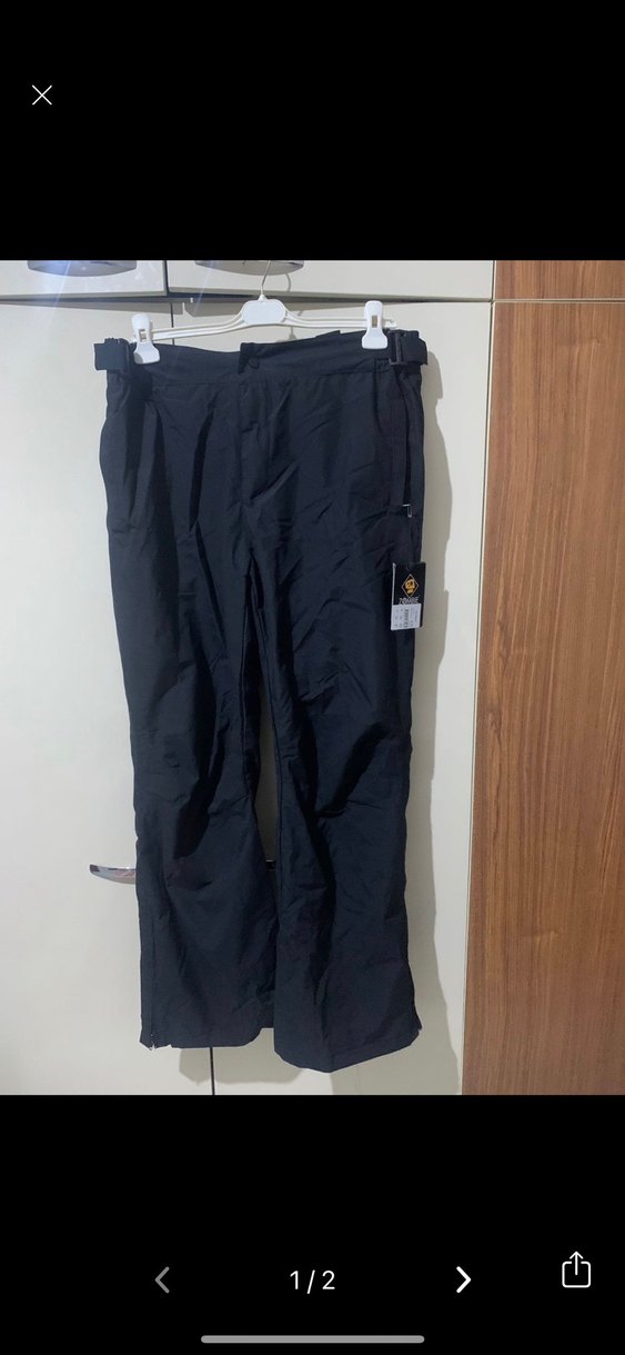 Kemerli bel ve bol kesim özellikli siyah erkek kayak pantolonu. Dış mekan kullanımı için uygun, desen içermeyen sentetik kumaştan üretilmiştir.