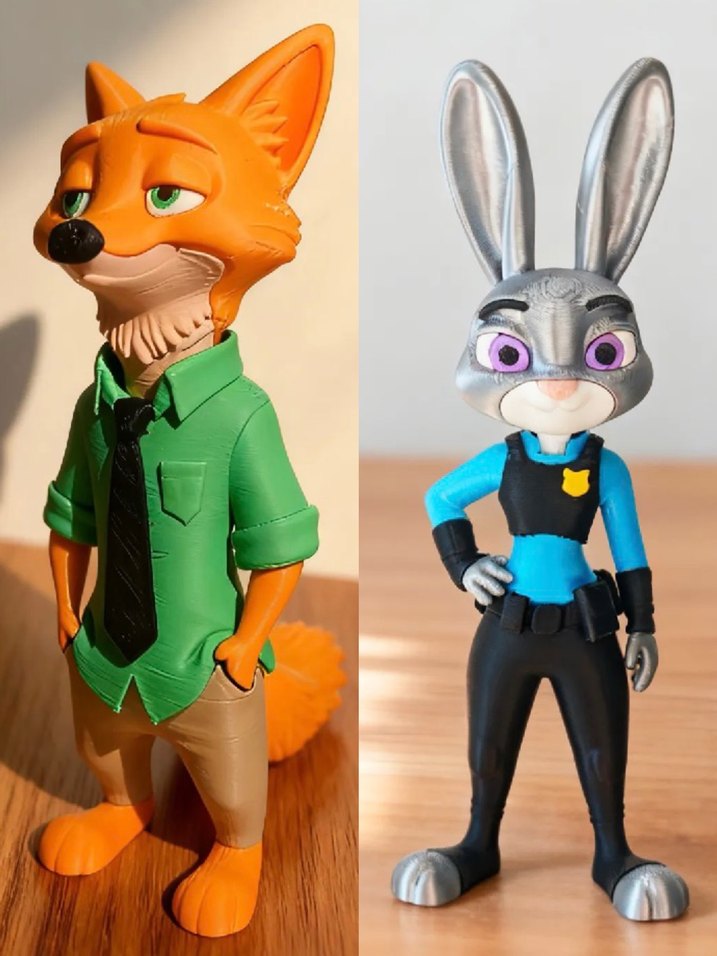 Zootopia filminden tilki ve tavşan karakterlerinin detaylı, canlı renklerde figür seti.
