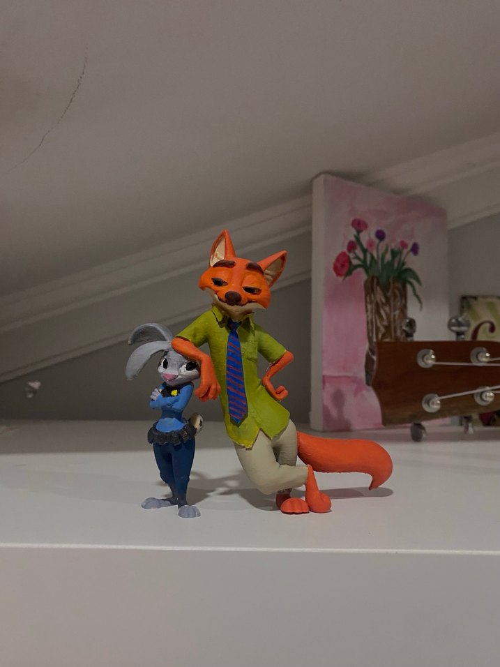 Nick Wilde ve Judy Hopps karakterlerinin renkli, detaylı Zootopia figürleri. 3D baskı makinesinden basılıp akrilik ile renklendirilmiştir. Tepe boy: yaklaşık 11-11.5 cm’dir.