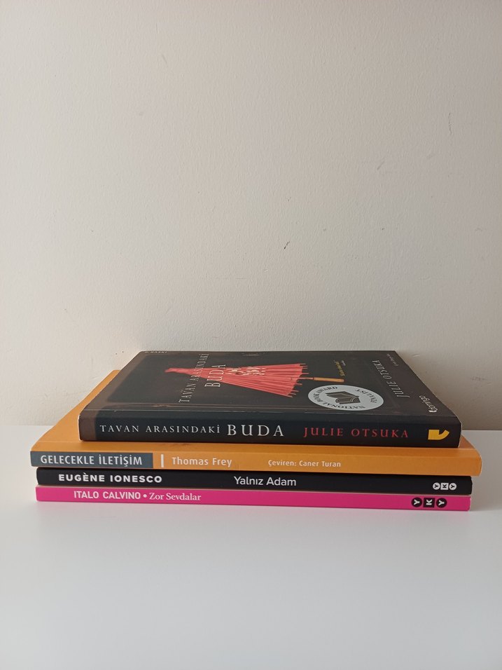 Julie Otsuka'nın 'Tavan Arasındaki Buda', Thomas Frey'in 'Gelecekle İletişim', 'Yalnız Adam', Eugene Ionesco ve Italo Calvino'nun 'Görünmez Şehirler' romanlarını içeren kitap seti.