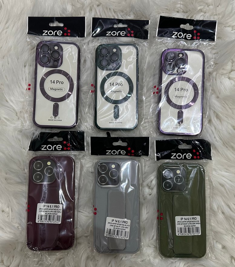 Zore markasının manyetik özellikli, stand bölmeli 14 Pro telefon kılıfı. Koyu tonlarda çok renkli ve streetwear tarzında.