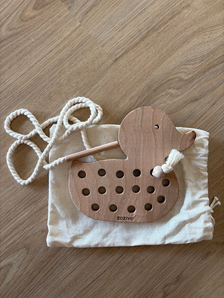 Hafif kahverengi ahşap ördek şekilli, delikli ve ipli örme oyuncağı. İnce motor becerilerini geliştirmeye yardımcıdır. Bez torba ile birlikte gelir.