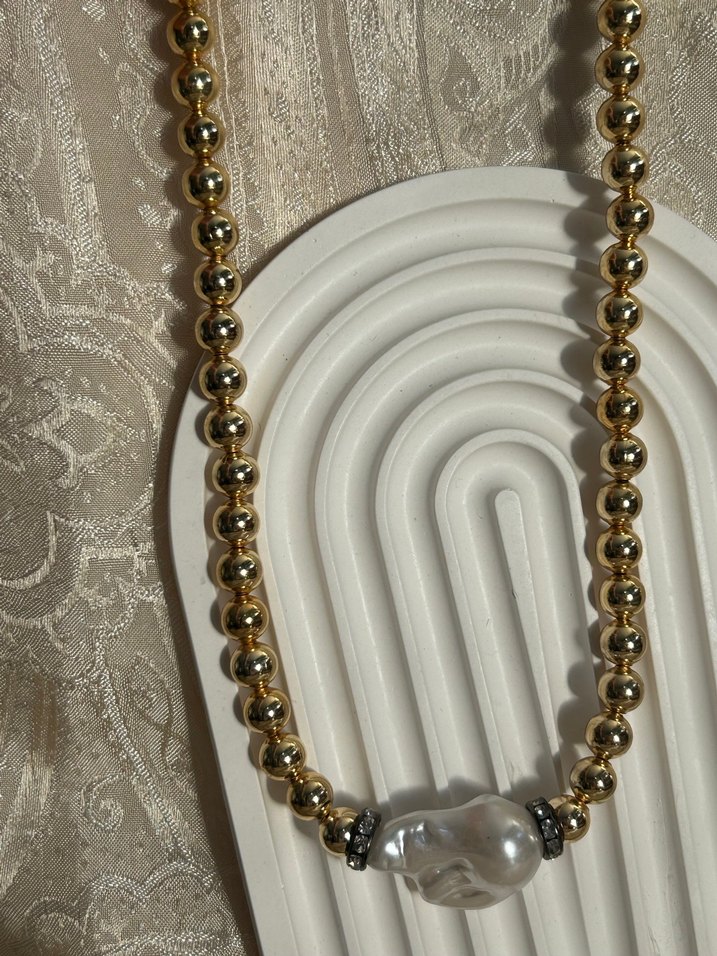 Uzun, parlak altın boncuklardan oluşan kolye, ortasında inci görünümlü boncuk bulunur. Bohem ve ışıltılı tarzı yansıtır. ✨