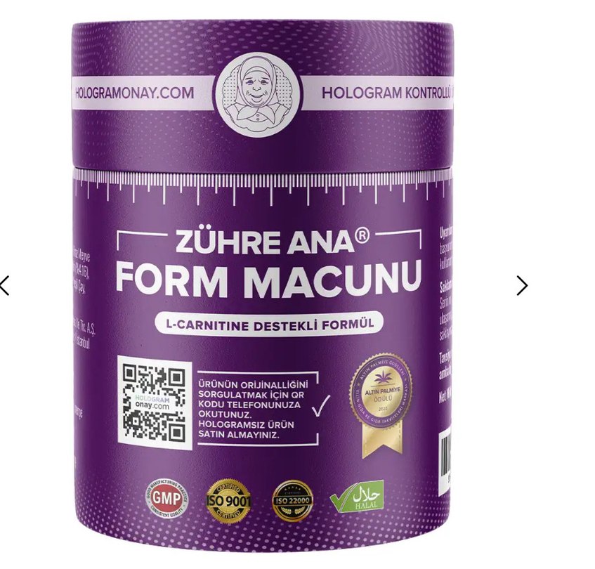 Zühre Ana Form Macunu, L-Carnitine destekli formülü ve parlak mor toz yapısıyla sunulur. Ürünün orijinalliği QR koduyla kontrol edilir.