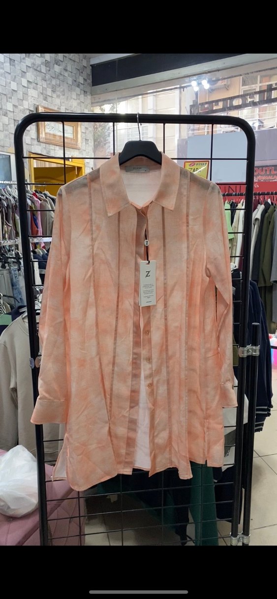 Uzun boylu, bol kesim kadın gömlek, yakalı ve düğmeli. Yumuşak keten kumaştan,