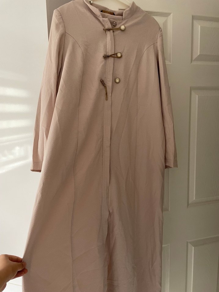 Açık krem renkte, düğmeli, uzun kadın pardesü . İpek gibi yumuşak kumaştan, klasik şıklık ve ofis kullanımı için uygundur son fotoda cep tarafında ufak bir delik var belli olmuyor iade yoktur .