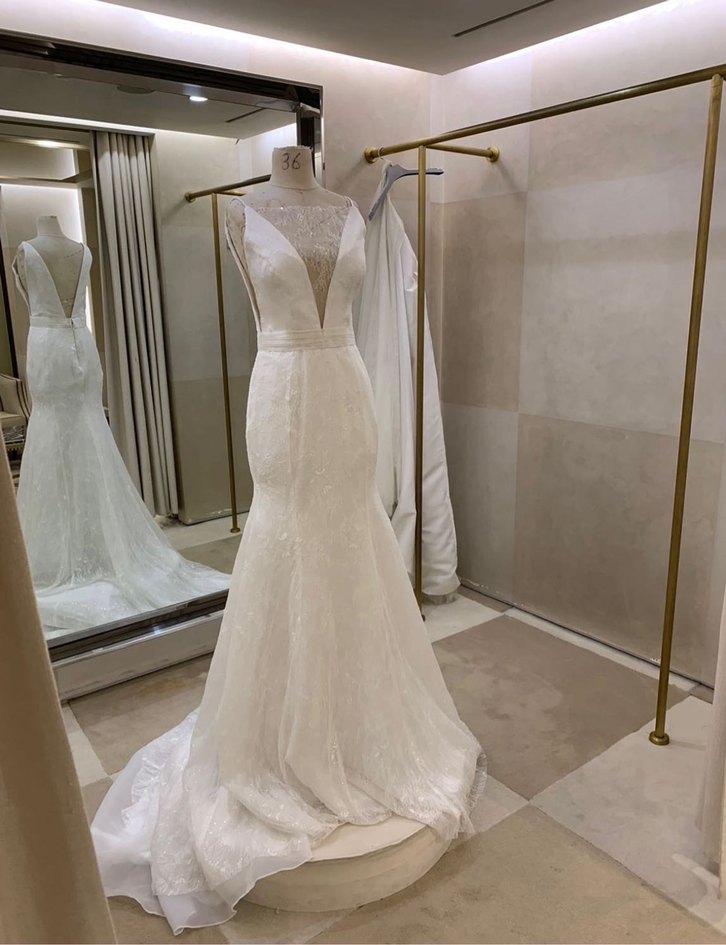 Modern klasik tarzda, V yakalı ve kolsuz, uzun A Balık kesim beyaz gelinlik. Hafif kumaşıyla minimal ışıltılı ve şık bir görünüm sunar. Züleyha Kuru’dan alındı hiç giyilmesi terzi işlemi görmedi defosu bulunmamaktadır. 34-36 beden uyumludur.