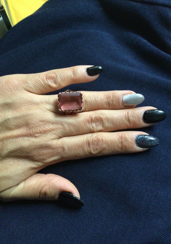 Büyük pembe parlak taşlı, gotik stile sahip yüzük. Romantik akşamlar ve yenilikçi tarzlar için uygundur.