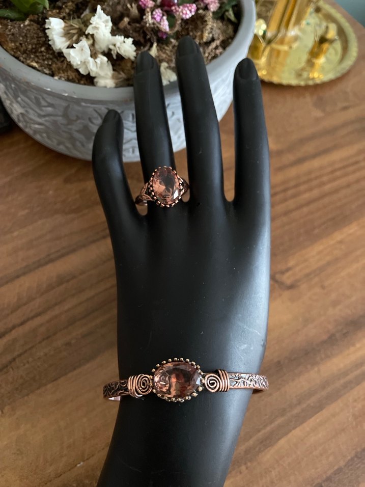 Zultanit taşlı yüzük ve bileklik seti. Materyal bakırdır. Farklı ışıklarda Renk değiştirir.