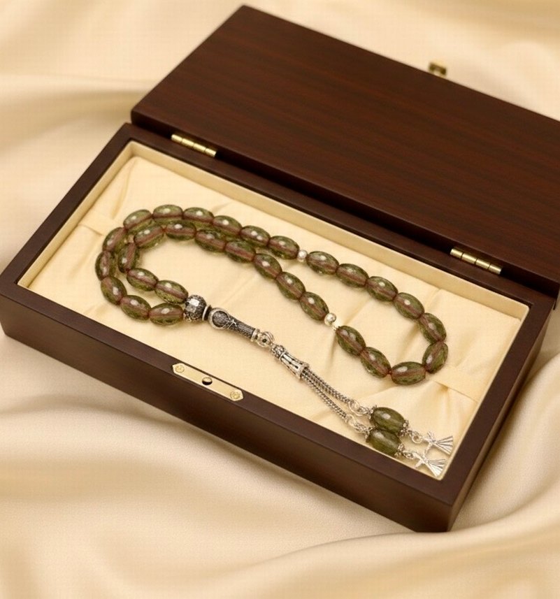 Parlak haki renkte, klasik tasarımlı erkek tesbih, vintage tarzda, gümüş renk püskül detaylı oval boncuklar içerir.