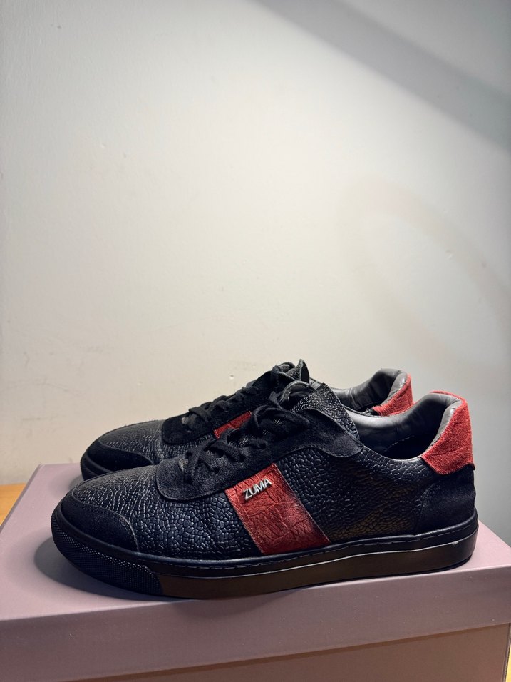 Yılan desenli dokusu ve kırmızı detayları olan siyah erkek spor ayakkabısı. Kauçuk tabanlı ve bağcıklı, sokak stili için uygun.