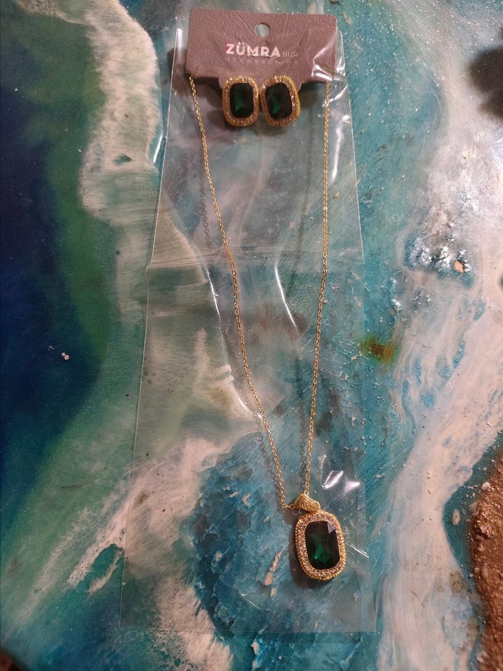 Zümra markalı, altın renk zincirli takı seti, yeşil dikdörtgen taşlarla bohem tarzı tamamlar.