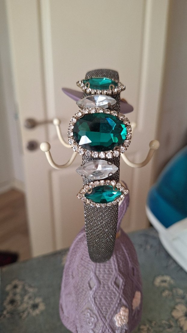 simli gri üzerine yesil tasli taç, günlük tisort ve kodlarla çok şık oluyor.