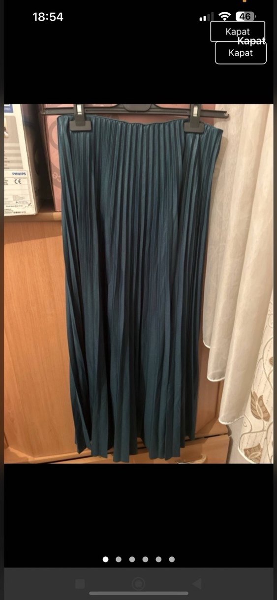 Pileli, piliseli ve bol kesimli zümrüt yeşili uzun etek. Bohem tarzıyla ofis ortamına uygundur.