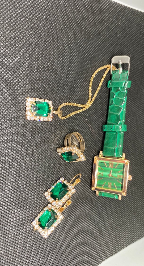 Yeşil taşlar ve payet detaylı, desenli saat kayışıyla günlük kullanıma uygun, gösterişli ve sokak modası tarzında kadın takı seti.